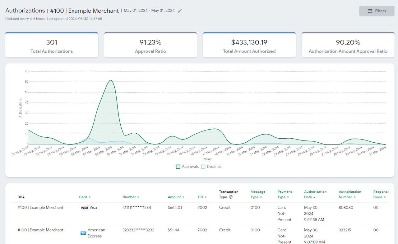 The Authorization report gives a view of all card authorizations being processed on your MID(s). Use the filter on the top right to filter card data or date range.