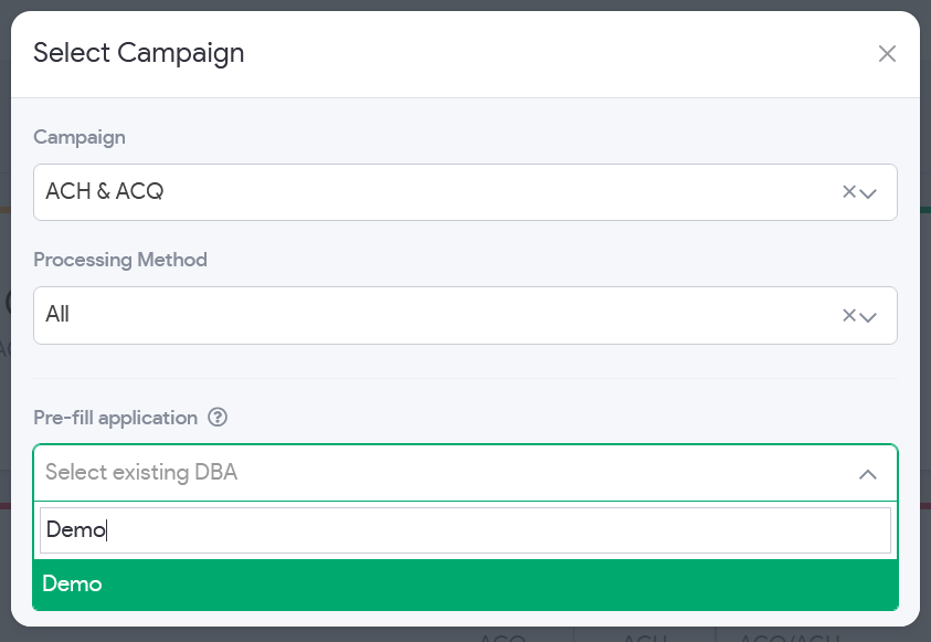You will see a pop-up where you can select the pricing campaign and the processing method. In addition, you can optionally pre-fill information from an existing DBA by typing in the box and selecting the choices. (i.e., an existing customer wants another MID).