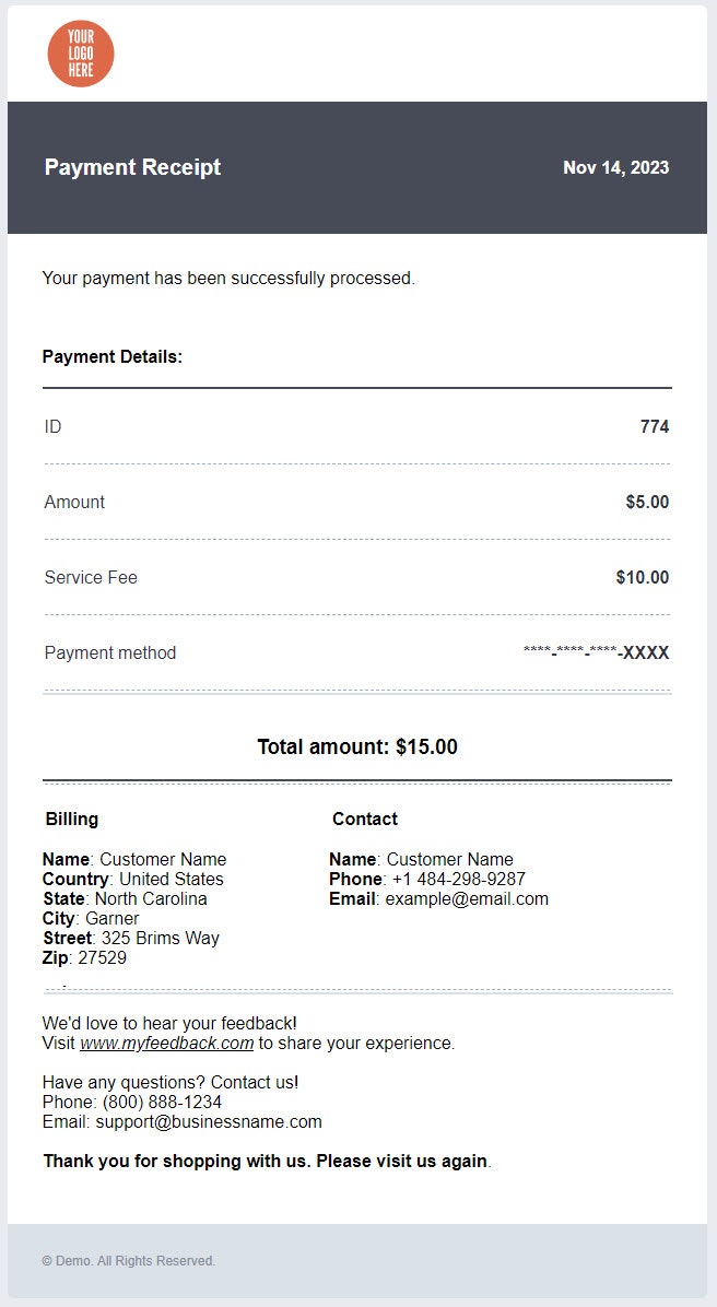 The Customize Receipt function enables businesses to modify the payment receipts emailed to customers after a successful transaction.
