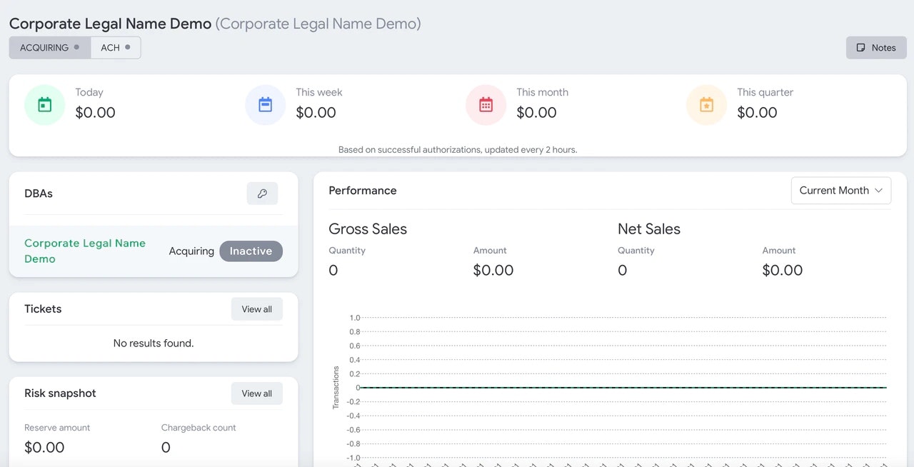 The Merchant Profile page will give an overview of processing for this merchant, any tickets, risk overview, TIDs, and PCI information.