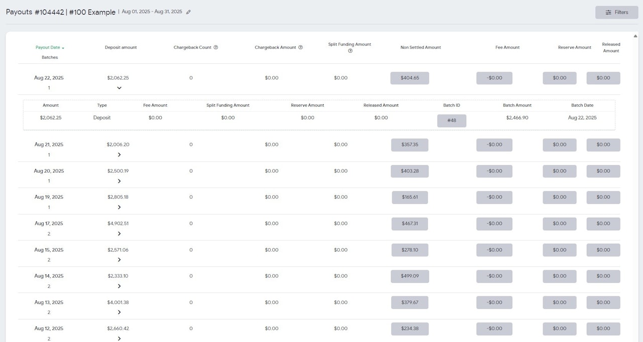 On this page, you can view fees, reserve amounts, or chargeback activity related to the Amount deposited into your account.
