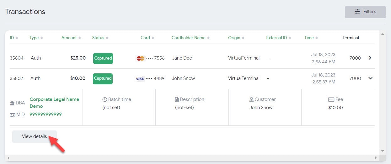 Click on a transaction to expand details. Clicking the 'View details' button will provide additional information related to your transaction and includes the option to VOID / REFUND.